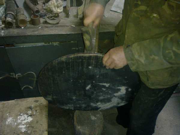 Мастер одной рукой держит мастерок, прижимая его к внутренней поверхности кувшина, а с внешней, через глиняную стенку аккуратно бьет по нему лопаткой. В это время глина уплотняется и на ней образуется рисунок в виде диагональных полосок.