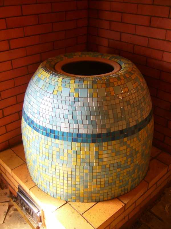Перед обмазкой кладку увлажняют с помощью пульверизатора и наносят раствор слоем не больше 1 см, так как более толстый слой при обжиге может потрескаться. Горловину также следует обмазать, выполняя закругления. Чтобы печь выглядела более декоративно, с внешней стороны можно выложить мозаику или природный камень.