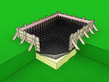 Если выбран в качестве основы плитный фундамент, он армируется прутком 10 мм в диаметре. Укладывается вдоль и поперек фундамента с шагом в 20 см, в месте пересечения связывается. Если вязать специальной проволокой не умеете, можно стянуть пластиковыми хомутами. Допускается для данной модели армирование готовой сеткой из толстой проволоки. Выставляется по краям опалубка и все заливается бетоном марки М250. Работы можно начинать через неделю, если среднесуточная температура была не ниже +20°C, и через две, если было +17°C.
