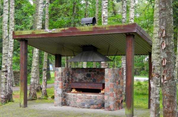 Печь-мангал с плитой можно установить в саду. В этом случае необходимо выбрать свободную от деревьев территорию. Если плотность посадки растений высока, месторасположение будущей печи необходимо расчистить от них. Согласно требованию пожарной безопасности, вблизи источников огня не должно находиться зеленых насаждений.