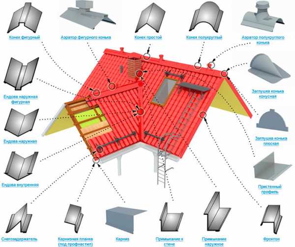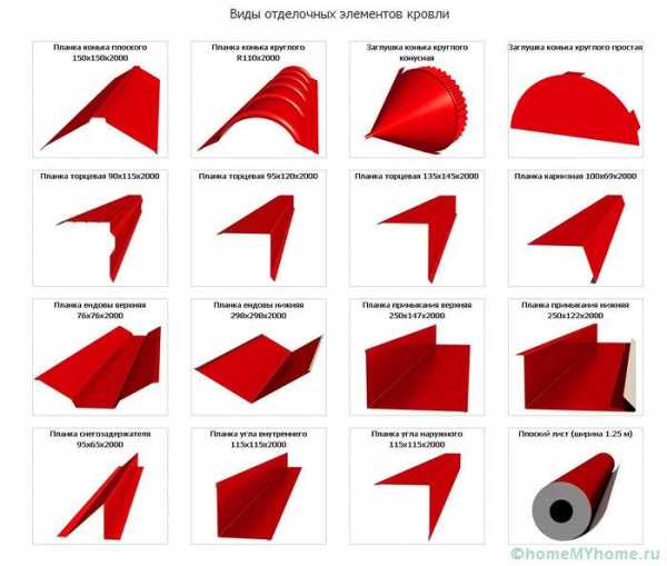 В пошаговой инструкции по монтажу металлочерепицы должны быть упомянуты основные элементы, использующиеся совместно с листами. Они используются в зависимости от конфигурации крыши и эксплуатационных особенностей.