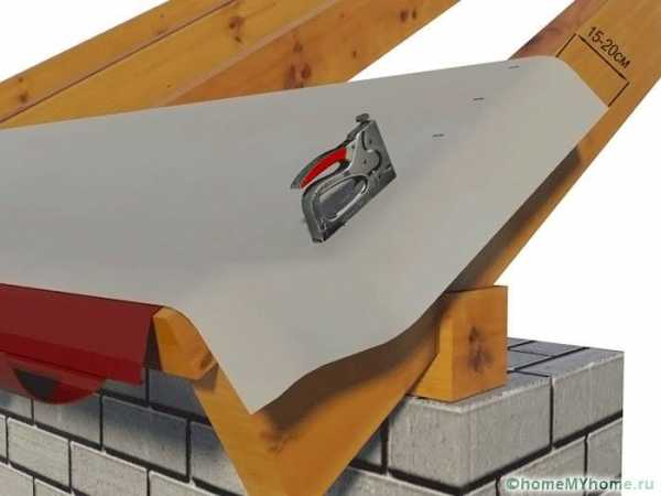 Пленка фиксируется на стропильных ногах скобами, забитыми с помощью строительного степлера, и окончательно крепится к стропилам контрольной рейкой, на которой впоследствии собирается обрешетка для черепицы. Для более надежной изоляции стыки нахлеста пленки дополнительно склеиваются клейкой лентой.