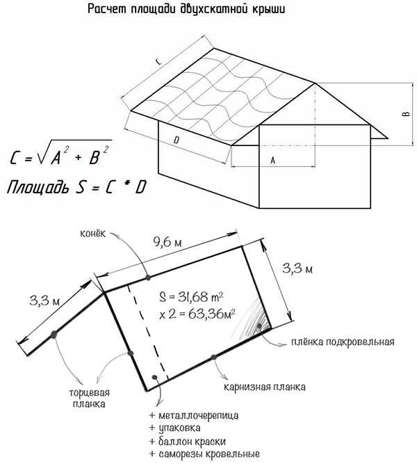 - Рассчитать площадь кровли. Если крыша двухскатная, то сделать это будет несложно. Трудности с расчетами возникнут при более сложной конфигурации кровли. Для четырехскатного, ломаного или другого варианта, следует высчитать площадь каждого ската по отдельности.