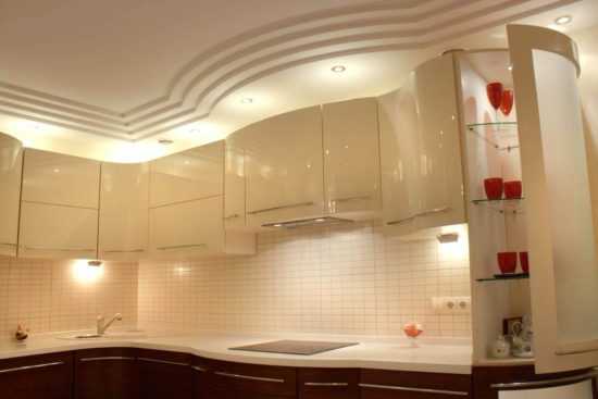 Допускается даже при самой небольшой высоте, если, конечно, не затрудняет перемещение. Весь секрет – в удачном выборе места для фигур второго уровня и в их конфигурации. Ну а многоуровневый потолок на кухне по красоте и оригинальности ничем не уступает своему собрату из самой роскошной гостиной.
