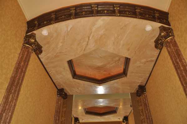 - Например, простую конструкцию из подшивного потолка и короба по периметру можно разнообразить так: сделать короб более широким, установить встроенные светильники, а центральную зону отделать венецианской штукатуркой или мозаичной – прекрасный вариант для классического интерьера.