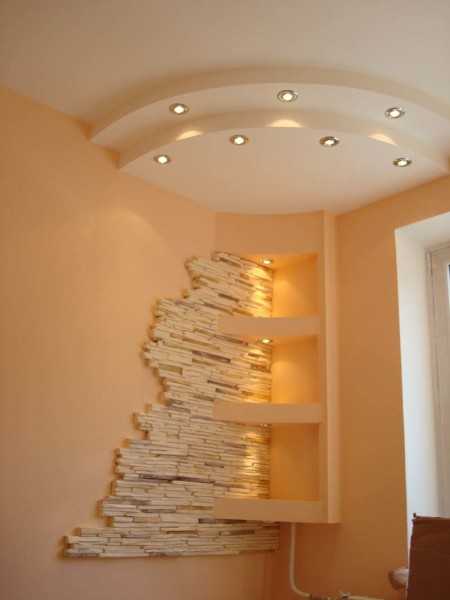 2. Двухуровневый – чрезвычайно разнообразен. В этом случае на каркас первого уровня монтируют каркас второго в виде геометрически правильных или плавно очерченных или асимметричных фигур. Дизайн подбирают в соответствии с требованиями стиля: