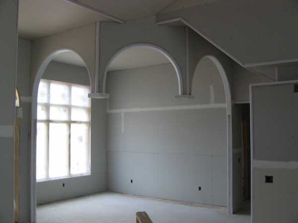 - Арки – треугольные, циркульные, параболические, вогнутые, трехлопастные, ползучие, то есть, с изменением радиуса искривления, или еще более сложной конфигурации. Благодаря гибкости листа ГКЛ любые из них можно реализовать.