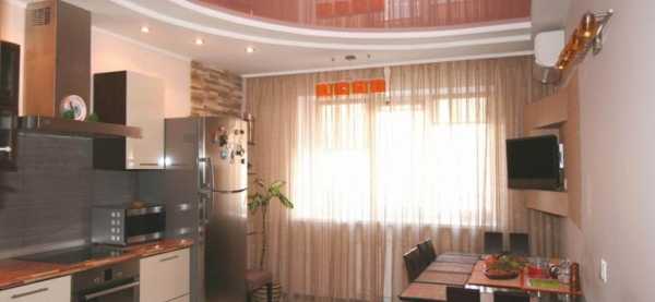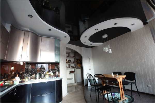 4. Комбинированный – как минимум двухуровневый потолок, в котором часть каркаса обшита не ГКЛ, а декорирована натяжным полотном – ПВХ-пленкой. Это решение прекрасно подходит для кухни, поскольку пленка отличается водостойкостью, но, правда, относится к горючим веществам. Зато декоративные ее возможности огромны.