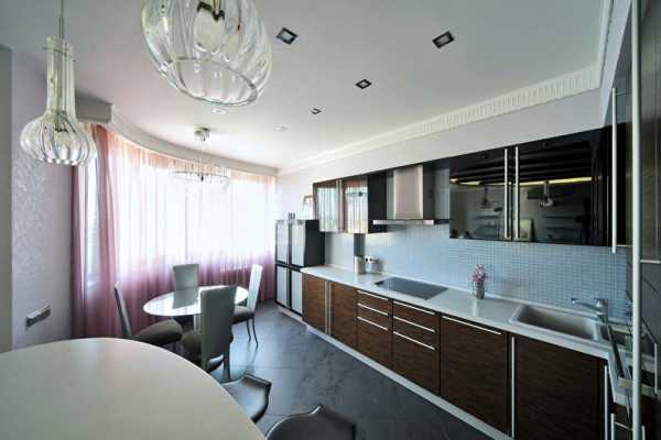 - Неправильную геометрию комнаты можно исправить, зная особенности цвета изменять геометрию пространства. Темные цвета забирают объем, а светлые делают кухню просторней. Фрагментарное применение темного цвета концентрирует внимание. Можно эффектно комбинировать черно-белую модную в этом сезоне гамму, чтобы сделать кухню просторней.