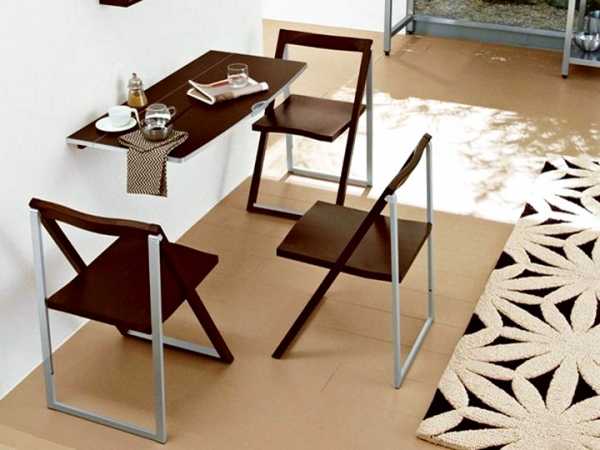 В маленьких помещения столы с откидными столешницами становятся настоящей находкой, ведь в сложенном виде они не занимают места, превращаясь в тонкую доску, плотно прижатую к стене. Фиксируется такая мебель шурупами, а вот опираться она может на небольшие ножки.