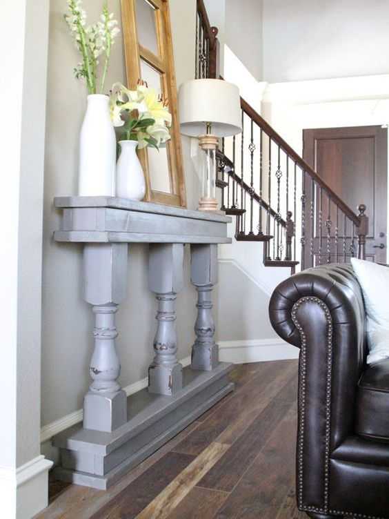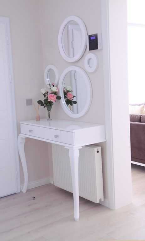 Можно использовать половинку стола, половинку стола-консоли, половинку тумбочки или чего угодно. Зависит от ваших потребностей. Такие столики легко можно сделать из старых столов, которые у вас стоят без дела. Просто разрежьте столик пополам, покрасьте его в нужный цвет, можно сделать патинирование, можно поменять фурнитуру. Можно переделать другой предмет мебели в такой столик. Просто столик легче всего распилить. Если у вас достаточно места – используйте половинку круглого стола, она круче смотрится. А теперь посмотрим на вдохновляющие идеи.