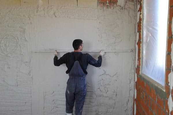 После застывания гипса штукатурку набрасывают на стену между маячками в достаточно большом объеме и равномерно распределяют его правилом, двигаясь снизу вверх. При этом излишки смеси перераспределить в те места, где наблюдается ее недостаток.