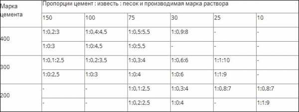 Таблица пропорций известково-цементного раствора для штукатурки, растворы разной плотности, расчет на 1 мешок цемента (25 кг):
