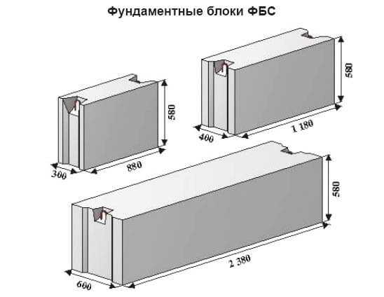 Геометрические размеры производящихся сегодня фундаментных блоков ФБС имеют высоту 300мм или 600мм и ширину от 300мм до 600 мм с шагом в 100мм (300, 400, 500, 600). Длина железобетонного фундаментного блока ФБС может составлять 600, 800, 900, 1200 и 2400мм.