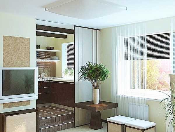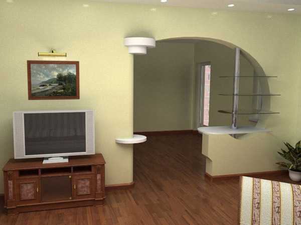 Не стоит беспокоиться, что пространство «сольется», ведь можно зонировать помещение с помощью арок либо разных элементов отделки пола и стен. Хорошо будет включить в дизайн маленьких квартир хрущевок шкаф или диван, раскладывающийся в кровать, ведь тогда вам не придется выделять отдельное место для спальной зоны.