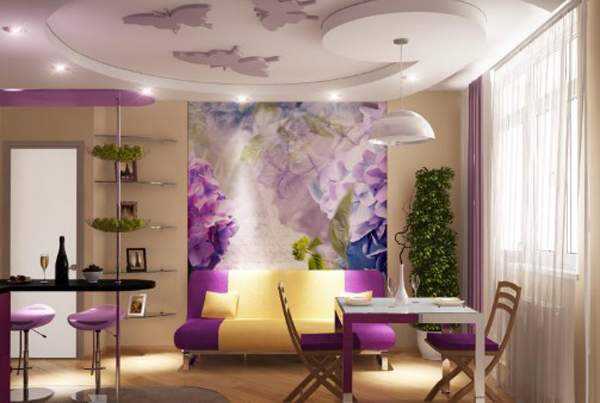 Сиреневые и фиалковые тона встречаются в интерьере не очень часто, но с их помощью можно создать поистине изысканный дизайн гостиной в хрущевке. Очень интересное сочетание фиолетового получается с розовым, белым или светло-серым.