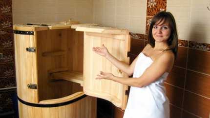 В традиционной сауне предусмотрена места для сидения и лежания. В условиях городской квартиры трудно разместить большие лежанки. Поэтому для маленькой ванной достаточно небольшой сауны по типу бочки, где человек может париться сидя.