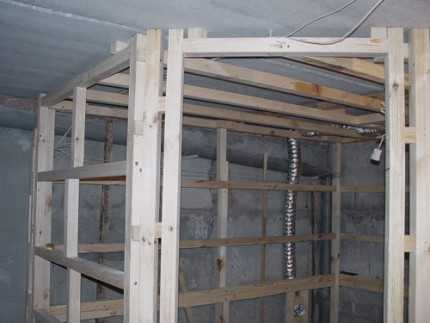 Затем закрепите между стойками горизонтальные перемычки из тех же досок. Устанавливайте их в шахматном порядке, что придаст конструкции большую жесткость. Также закрепите перемычку над дверным проемом. Далее нарежьте бруски 50х50 мм по ширине или длине парной и закрепите на потолке дюбелями с шагом 600 мм.