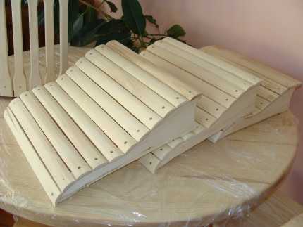 Вначале делаются стойки из бруса 50х50 мм. Их высота – 350 мм. Затем стойки нужно скрепить перемычками, ширина которых должна соответствовать ширине полков. В результате получатся П-образные детали – основа конструкции. Затем все П-образные детали связываем двумя перекладинами. При этом расстояние между стойками не должно превышать 50-60 мм. Получившийся каркас обшейте рейками 30х50 мм с шагом около 5 мм. Крепить обшивку можно либо при помощи дубовых шкантов, либо саморезами, вкручивая их с тыльной стороны. Готовое изделие тщательно отшлифуйте, чтобы поверхность была идеально гладкой.