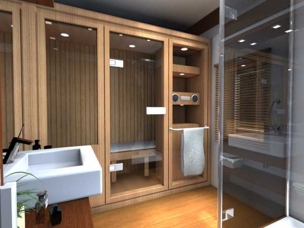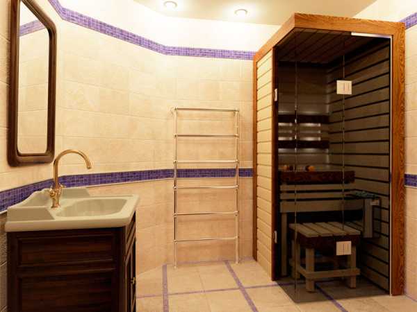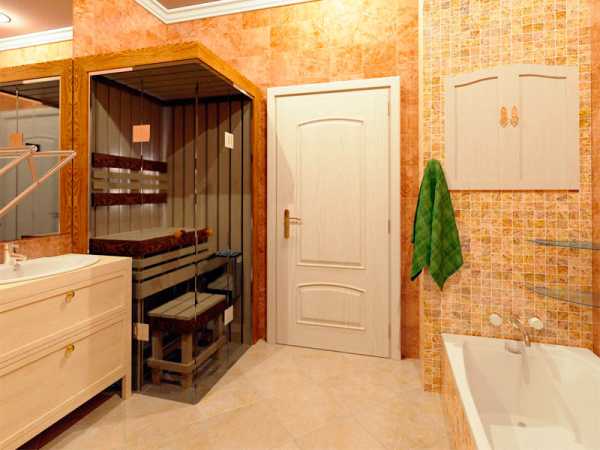 В просторной ванной комнате можно установить довольно большую сауну, в которой с комфортом могут расположиться несколько человек