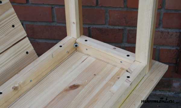 Передняя часть рамы закреплена под углом 90о, а спинка также скошена, как и ножки. Для того, чтобы спинка оказалась под углом, используйте временную деревянную опору. поместите ее на сидение, закрепите и зафиксируйте спинку, используя клей и шурупы. Теперь детали опоры можно снять.