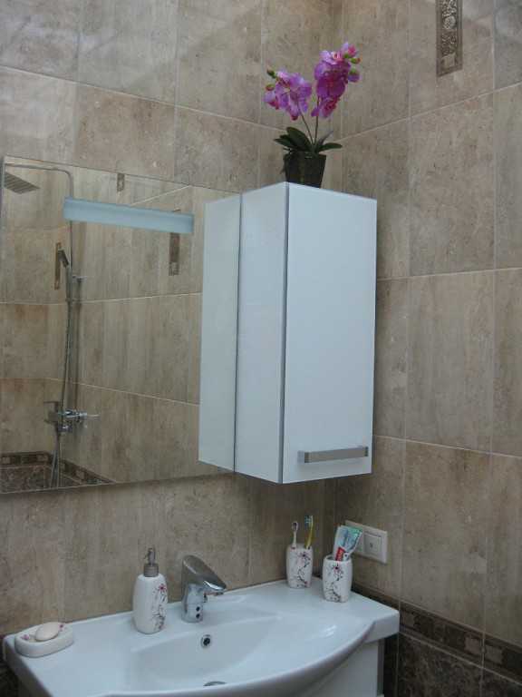 Небольшая высота навесных шкафов в ванной очень удобна для пользования, они рассчитаны таким образом, чтобы пользователю не нужно было тянуться к верхним полкам за нужным предметом.