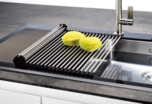 Это приспособление всегда находится под рукой. После эксплуатации его насухо протирают и ставят рядом с мойкой или укладывают в выдвижной ящик тумбы кухонного гарнитура. Производители предлагают Трофлексы в виде сворачивающегося коврика, который собран из силиконовых или пластиковых стержней. Эти модели бывают разного цветового оформления, так что подобрать нужное изделие в тон дизайну кухни не составит труда. Но в любом случае такие сушилки не несут дизайнерской нагрузки, они незаметны и имеют небольшой вес.