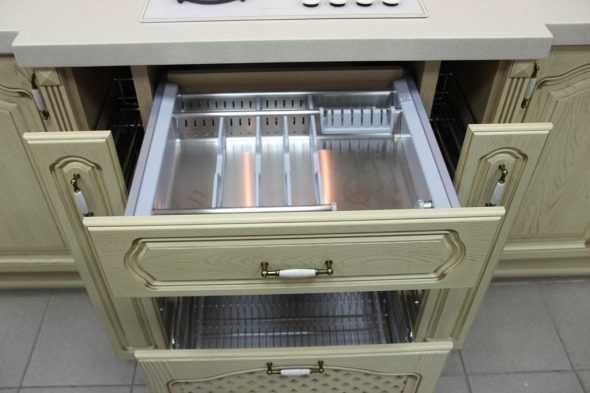 Другим заслуживающим внимания вариантом встраиваемых сушилок, являются изделия, разработанные для установки в нижних шкафах кухонного гарнитура. Выполняются такие сушилки аналогично обычным выдвижным ящикам.