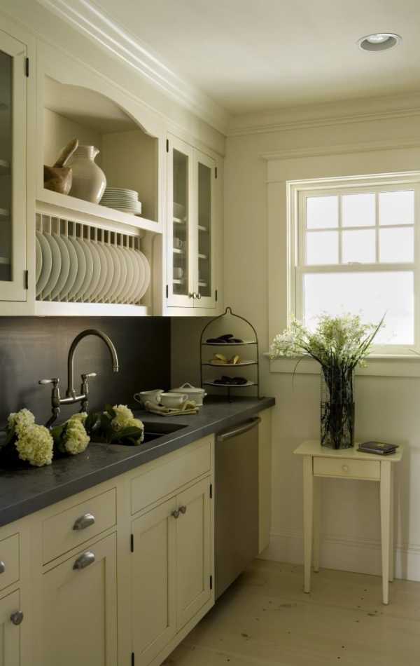 Дизайнерское решение об отказе от всего верхнего «пояса» кухни или расположение сушилки для посуды в нижнем напольном шкафу является зачастую единственным выходом.
