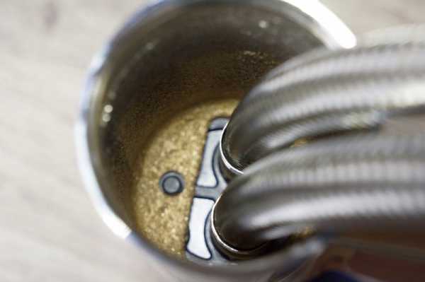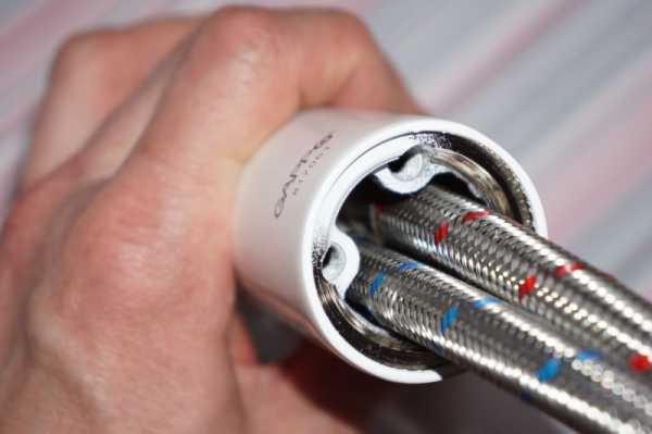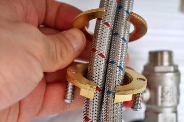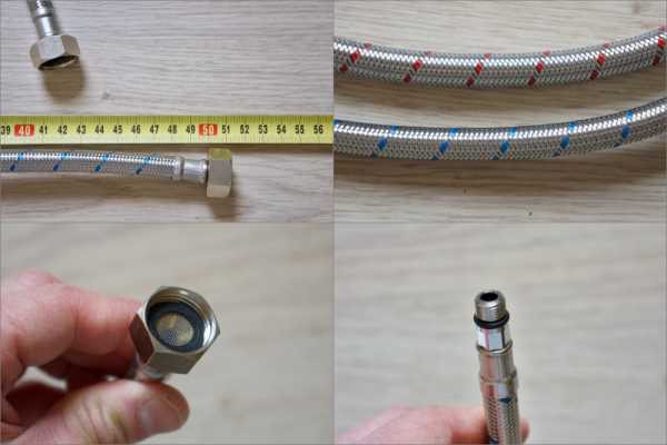 Шланги, самые обычные, продаваемые в любом сантехмагазине, в металлической оплетке, призванной повысить сопротивление резиновой трубки шланга давлению: