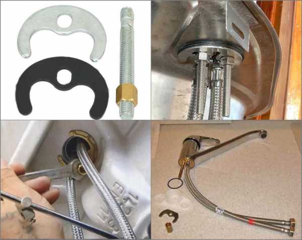 Сверху раковины смеситель устанавливается на металлическое кольцо с резиновой прокладкой: