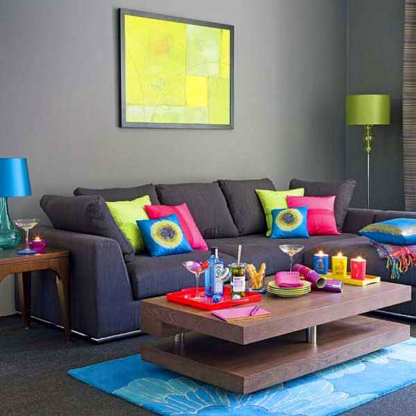 | Сочетание цветов в интерьере гостиной | Нейтральные, мягкие тона, которые разбавлены яркими акцентами. |