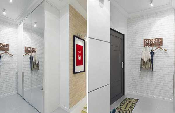 В небольших помещениях коридоров лучше всего будет смотреться белый декоративный кирпич с глянцевой поверхностью. Такой дизайн поможет увеличить площадь, сделать пространство более свободным, что характерно для современного минимализма, а также скандинавского стиля.