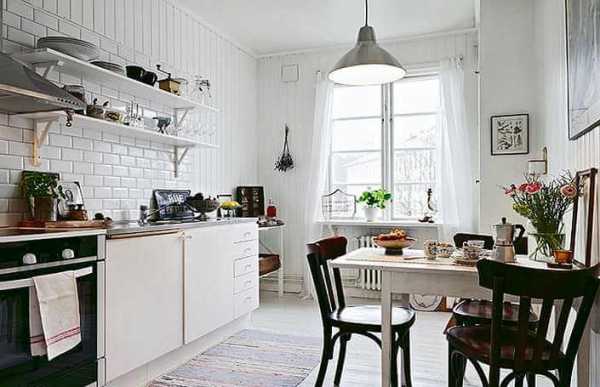 Белая мебель, высокие потолки и кирпичная стена создают по настоящему уютную атмосферу