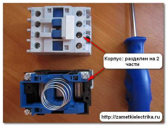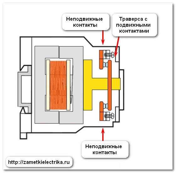 Нижняя часть закреплена на корпусе и является неподвижной, верхняя подпружинена и может свободно двигаться. В прорези нижней части магнитопровода устанавливается катушка. В зависимости от того, как намотана катушка, меняется номинал контактора. Есть катушки на 12 В, 24 В, 110 В, 220 В и 380 В. На верхней части магнитопровода есть две группы контактов — подвижные и неподвижные.