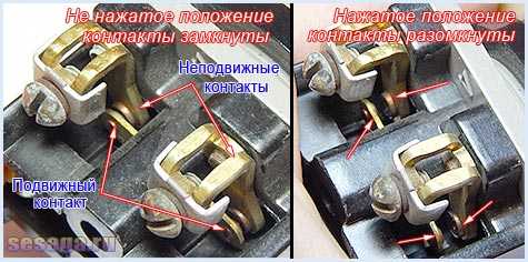 При отпускании кнопка опять возвращается в исходное положение пружиной, поддавливающей подвижный контакт, и он опять замыкает собой оба неподвижных контакта. На рисунке показаны контакты кнопки в нажатом и не нажатом положении.