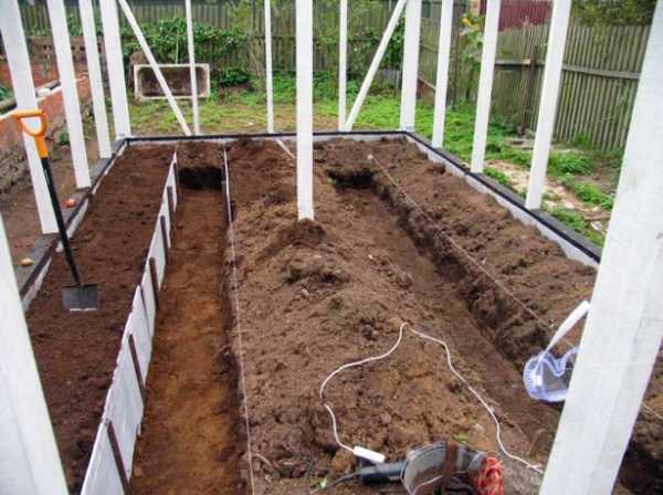 В теплице вырыта дорожка на два штыка (для того, чтобы холодный воздух оседал в этой яме, а не на растениях). А также для того, чтобы ходить не нагибаясь.