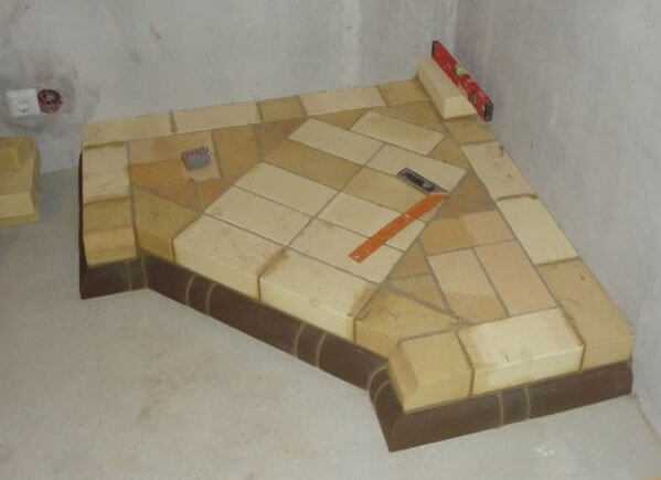 Материалом изготовления угловых печей, как правило, является керамический кирпич. Для топочной части используют шамотный огнеупорный кирпич. Кладка производится с помощью обычного печного скрепляющего раствора, который готовится на основе глины с добавлением песка и воды. Некоторые модели часто дополняются готовой чугунной топкой, которой обеспечивают полную герметичность.