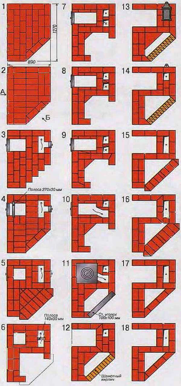 10. Ряды с 14 по 18 в целом похожи, они образуют дымовой канал, стенку у варочной панели, расширенную часть каминного дымосборника, а в 16 и 17 ряду выполняют также каминную полку. Их кладут по схеме.