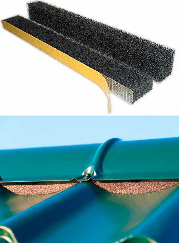 Уплотнители выпускают в виде лент с разными свойствами, которые укладывают по линии стыка между коньковыми деталями и металлочерепицей. Они бывают следующих видов: