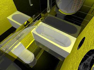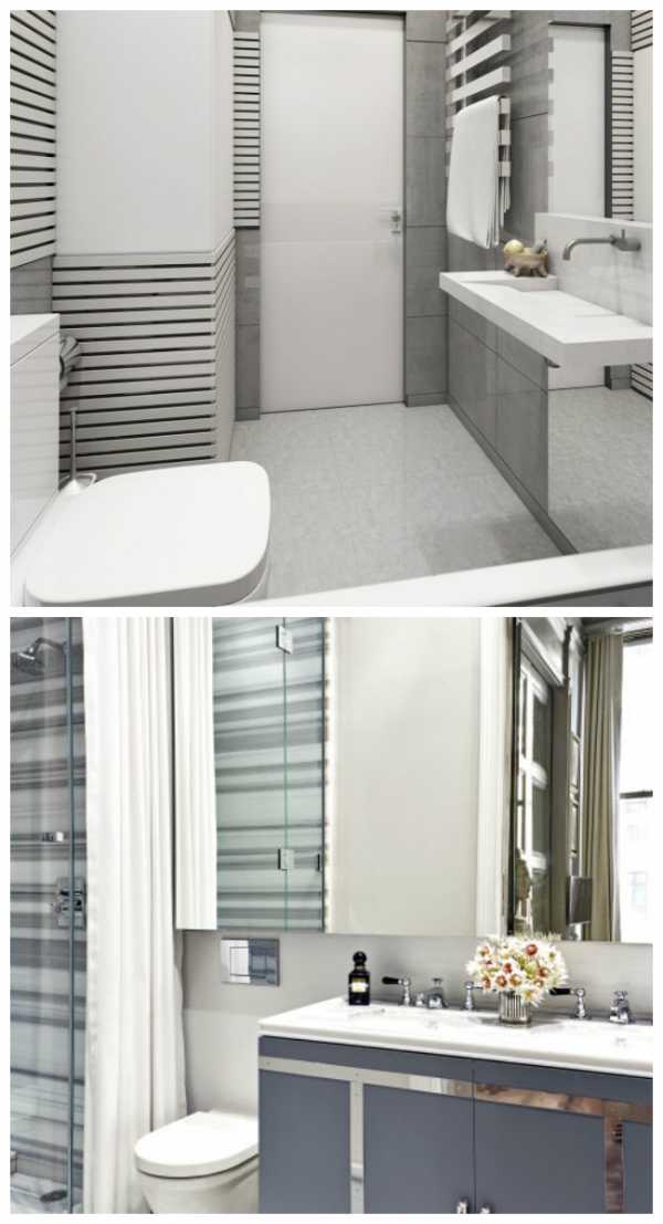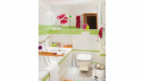 Поскольку дизайн ванной не привязан так к физиологии, желательно «подтянуть» его к дизайну туалета (см. статью о ремонте туалета). Вариант – разделение объема ширмой, но в и так маленьком помещении это не очень привлекательно. Еще вариант, дорогой, но эстетически великолепный – визуально увеличить объем помещения. Этого легко добиться с помощью облицовки зеркальной плиткой, см. рис. Лучшая и самая дорогая плитка – акриловая.