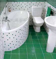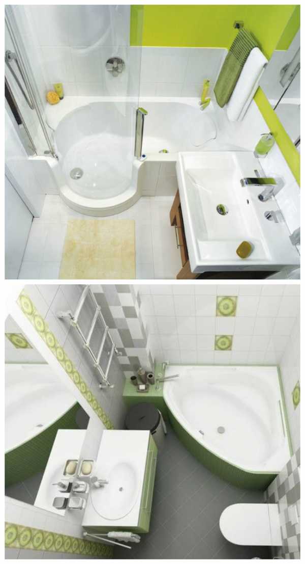 - Установка компактной угловой ванной, а вплотную к ней небольшой душевой кабины с полукруглой дверцей.