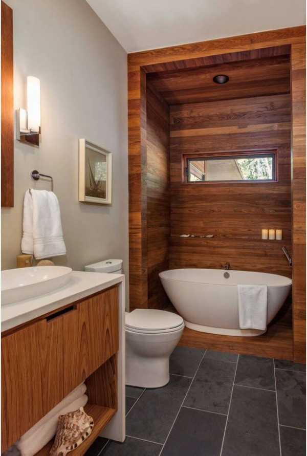 - Если душевая кабина категорически не подходит, стоит выбрать компактную угловую ванную – выглядит современно, позволяет экономить пространство.