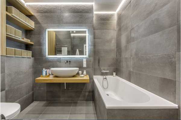 - Зонировать пространство можно не только при помощи освещения, но и с применением многоуровневого пола для акцентирования ванной или другой детали обстановки.