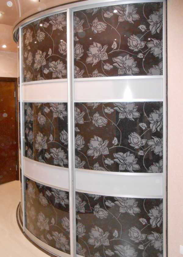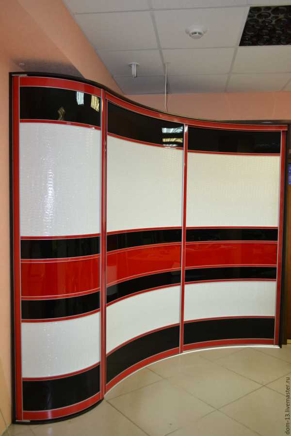 Имеют все составляющие стандартной модели, но дополнены изогнутыми дверями со стеклом, пластиком или другим фасадом; - встраиваемые радиусные шкафы